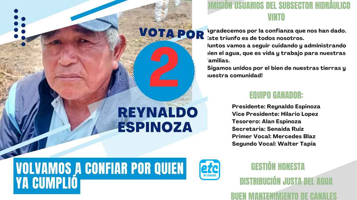 La Lista N.º 2, encabezada por Reynaldo Espinoza, obtuvo el respaldo mayoritario de los parceleros y agricultores del sector.