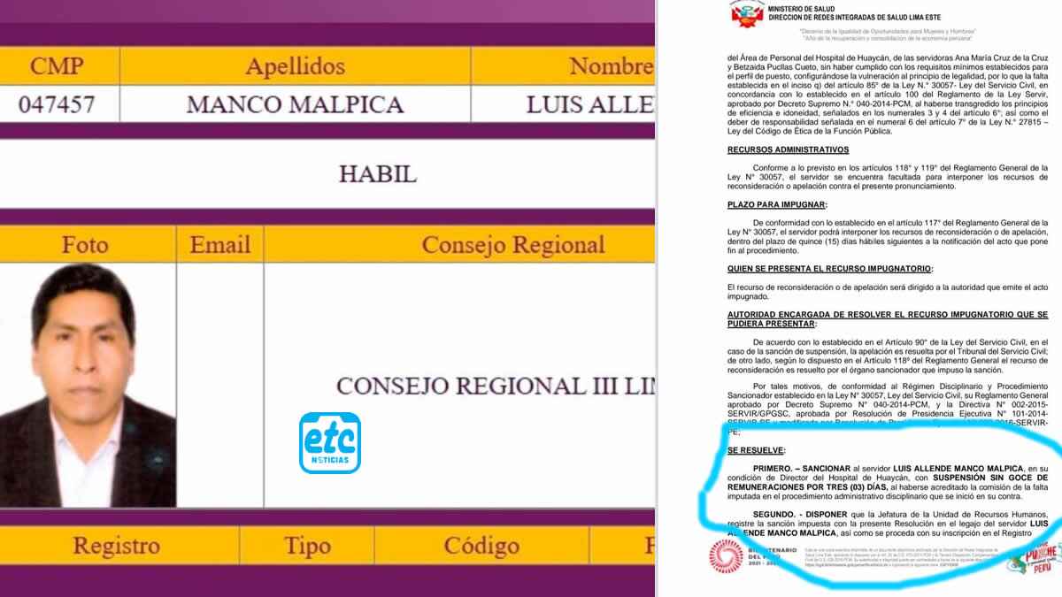 Según la Resolución Administrativa N.° 000489-2025-OGRH, de fecha 24 de junio de 2025, el actual director fue sancionado cuando se desempeñaba como director del Hospital de Huaycán, con suspensión sin goce de remuneraciones por tres días.