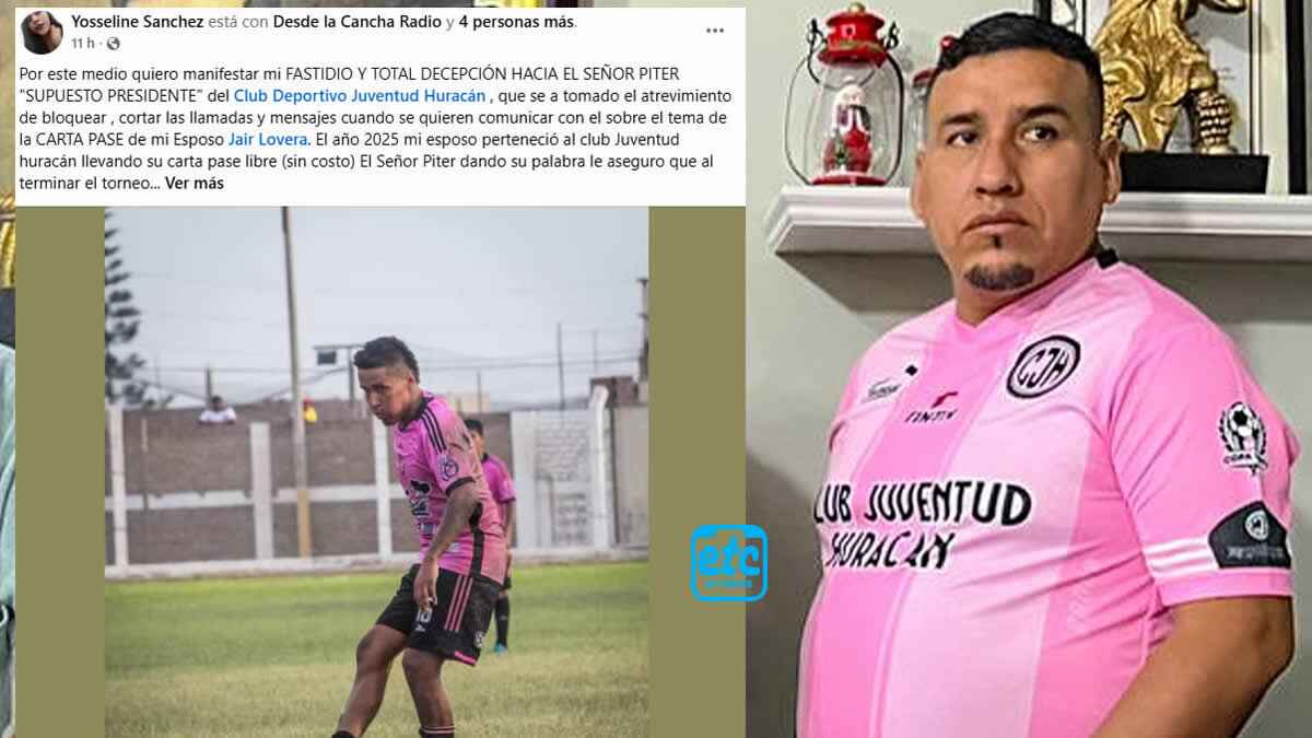 |ETC.PE|: La esposa del futbolista Jair Lovera denunció públicamente una presunta retención irregular de la carta pase de su esposo por parte del club Deportivo Juventud Huracán, situación que —según afirma— viene afectando seriamente su carrera profesional y la estabilidad económica de su familia.